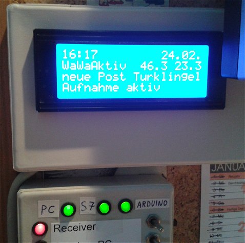 Das Display wirkt auf dem Bild heller als in Wirklichkeit. Darüber erfolgt die Ausgabe von Texten, die vom Phönix-Regler übers Netzwerk an den Arduino gesendet werden. Leider kann das Display Umlaute und manche andere Sonderzeichen nicht anzeigen.