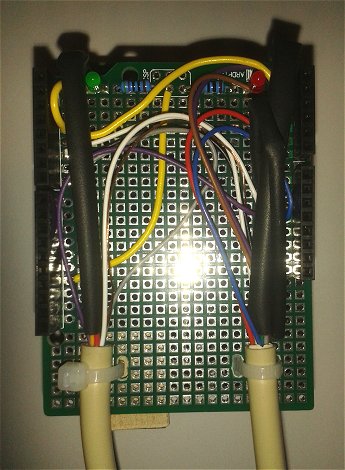 Mit der aufgesteckten Netzwerkplatine (Netzwerk-Shield) wird der Arduino netzwerkfähig und tauscht Daten mit dem Phönix-Regler zur Heimautomatisierung und dem Programm AutoRec aus.