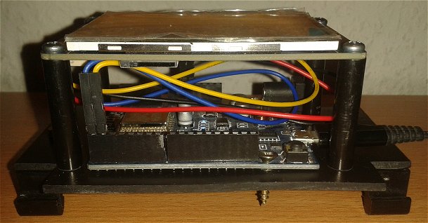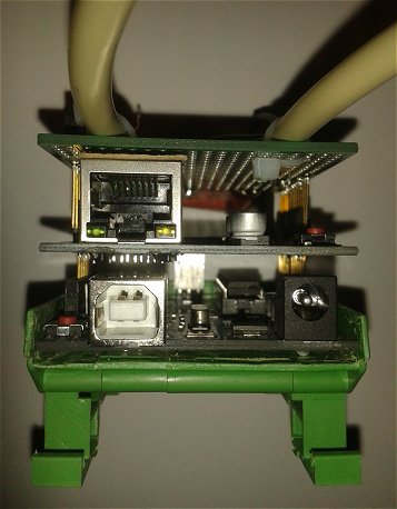 Der Arduino ist auf einen Halter für eine Hutschiene montiert.