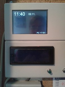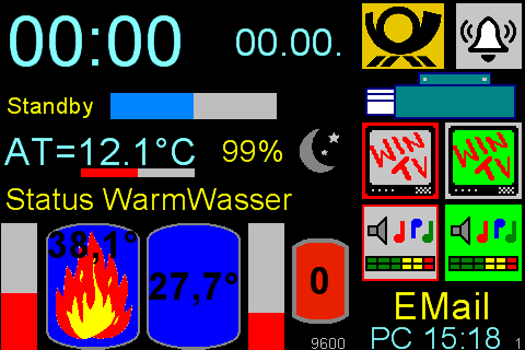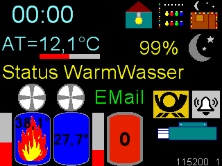 Die Anzeigen unterscheiden sich etwas vom Display im Wohnbereich. Oben: Uhrzeit, Anzeige für Licht: Wohnung, Garten linke und rechte Seite Aussentemperatur, darunter Hysterese zur Freigabe der Heizung, Darunter links und Mitte: Anzeigen zur Warmwasserbereitung
