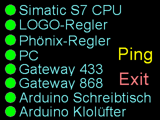 Nach Aufruf der Seite oder nach Antippen von "Ping" werden die Netzwerkteilnehmer angepingt. Wenn dies bei jedem Netzwerkteilnehmer erfolgreich ist, ist dies in weniger als einer Sekunde erledigt. Durch Antippen von "Exit" wird diese Seite verlassen und wieder die Hauptseite angezeigt. |