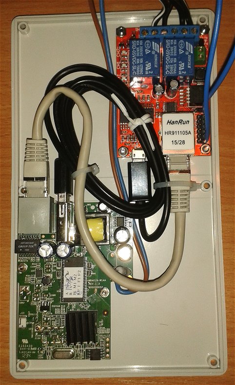 Innenleben Inkl. Verkabelung zwischen den beiden Platinen zum Datenaustausch und zur Stromversorgung des Relais-Moduls.