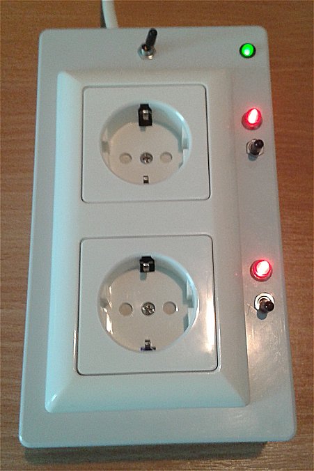 Ansicht von oben Mit dem Schalter oben wird das Gerät eingeschaltet. Die grüne LED wird durch die Betriebsspannung für das Relais-Modul eingeschaltet. Neben dem Schalten über das Relais-Modul kann man jede der zwei Steckdosen auch manuell über den Schalter rechts davon einschalten. Die rote Leuchte signalisiert die Netzspannung der Steckdose. Unabhängig davon, ob sie durch das Relais-Modul oder durch den Schalter eingeschaltet wurde.